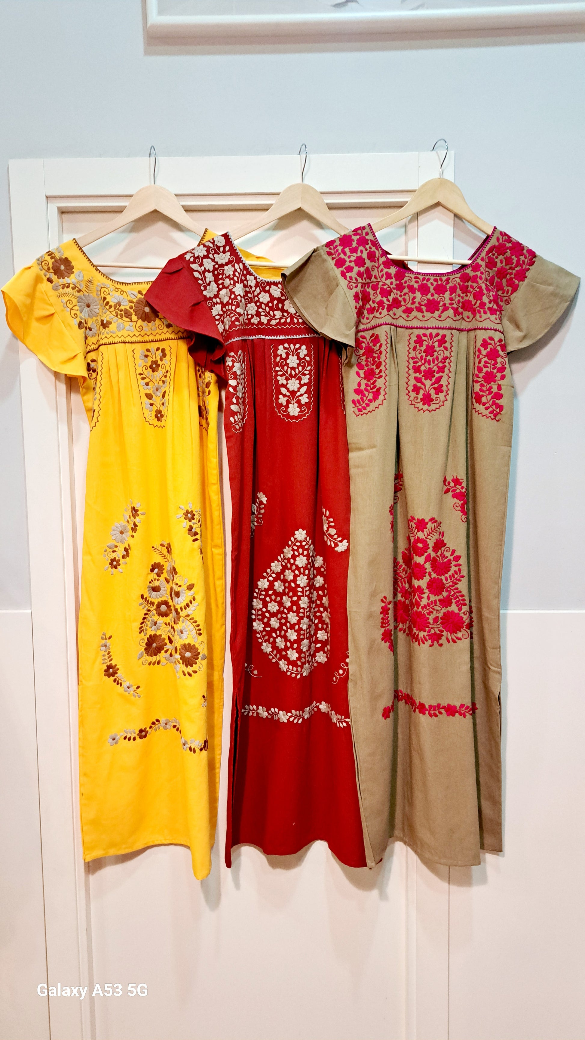 Vestido bordado clásico con mangas haciendo pliegues .